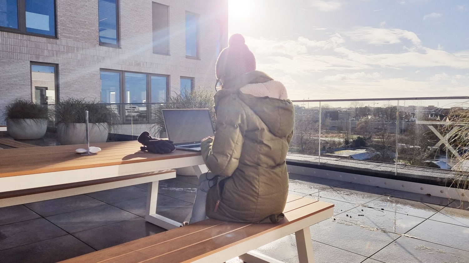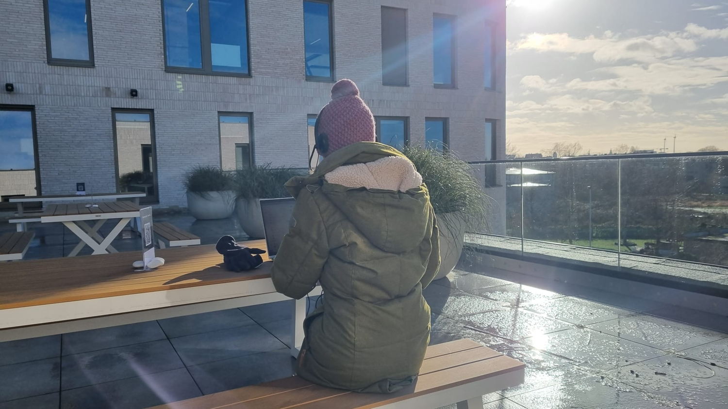 Het is eens wat anders, je mails beantwoorden of je koffiepauze houden in de winterse buitenlucht. Afgeschermd van de wind en met extra dekentjes kunnen CM-medewerkers de kou op hun alternatieve werkplek trotseren.